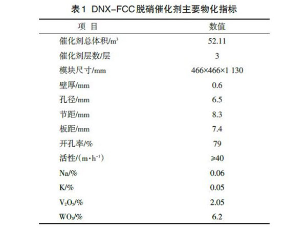 托普索公司DNX-FCC催化劑采用波紋板式催化劑,以TiO2為載體,活性物質(zhì)為金屬釩和鎢氧化物,其主要性質(zhì)見表1。