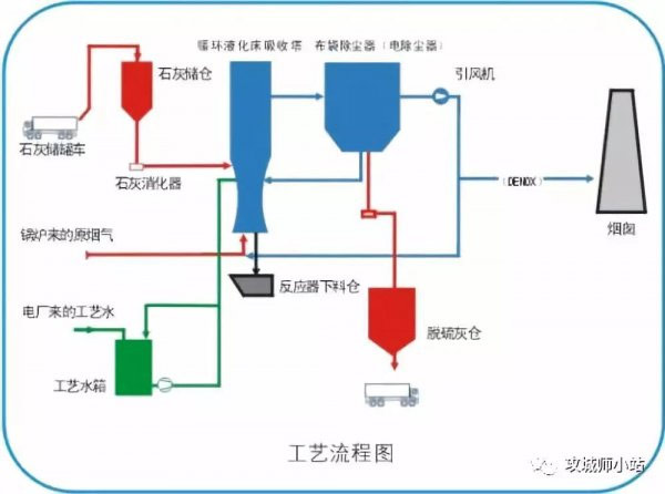 煙氣循環(huán)流化床脫硫工藝由吸收劑制備、吸收塔、脫硫灰再循環(huán)、除塵器及控制系統(tǒng)等部分組成。該工藝一般采用干態(tài)的消石灰粉作為吸收劑,也可采用其它對(duì)二氧化硫有吸收反應(yīng)能力的干粉或漿液作為吸收劑。由鍋爐排出的未經(jīng)處理的煙氣從吸收塔(即流化床)底部進(jìn)入。