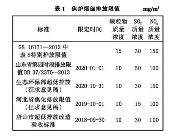 《煉焦化學(xué)工業(yè)污染物排放標(biāo)準(zhǔn)》(GB 16171-2012)對(duì)焦?fàn)t煙氣排放提出了明確的限值要求,隨著國(guó)家《大氣污染防治法》的實(shí)施,各省份和相關(guān)部門又制定了更嚴(yán)格的區(qū)域性超低排放標(biāo)準(zhǔn)和相應(yīng)的達(dá)標(biāo)時(shí)段要求(見表1)。焦?fàn)t煙氣實(shí)施脫硫、脫硝、除塵改造,實(shí)現(xiàn)達(dá)標(biāo)排放的形勢(shì)緊迫,其中高爐煤氣加熱焦?fàn)t的煙氣因溫度低、氣量大等特點(diǎn),凈化處理難度很大,對(duì)此業(yè)內(nèi)開展了多種達(dá)標(biāo)技術(shù)的研發(fā),其中近兩年新投用的3種凈化技術(shù):碳酸氫鈉干法脫硫+中低溫脫硝工藝、逆流活性焦脫硫脫硝一體化(CSCR)工藝、新型催化法活性炭脫硫脫硝一體化工藝,達(dá)標(biāo)效果較好,現(xiàn)予以對(duì)比分析,以期給采用高爐煤氣加熱焦?fàn)t的企業(yè)在選用煙氣凈化技術(shù)時(shí)提供參考。
