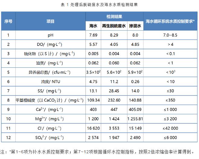 脫硫廢水原水經(jīng)再生工藝處理后用于海水循環(huán)冷卻系統(tǒng)補(bǔ)水,其主要通過與海水混合后進(jìn)入系統(tǒng)。以2×1 000 MW燃煤機(jī)組為例,其循環(huán)系統(tǒng)補(bǔ)水水量約為6 500 t/h,再生脫硫廢水量約為48 t/h,約占總補(bǔ)充水量的0.74%。按照此比例將再生脫硫廢水與海水進(jìn)行摻混,作為海水循環(huán)冷卻系統(tǒng)補(bǔ)水。處理后脫硫廢水及海水水質(zhì)檢測結(jié)果見表 1。