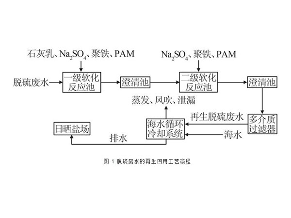 以北方T市某電廠處理后可達(dá)標(biāo)排放的脫硫廢水為原水,其水質(zhì)滿足《火電廠石灰石-石膏濕法脫硫廢水水質(zhì)控制指標(biāo)》(DL/T 997—2006)及《污水綜合排放標(biāo)準(zhǔn)》(GB 8978—1996)中一級(jí)排放標(biāo)準(zhǔn)。為了使其滿足海水循環(huán)冷卻系統(tǒng)的補(bǔ)水要求,對(duì)其進(jìn)行再生處理。脫硫廢水的再生回用工藝流程如圖 1所示。