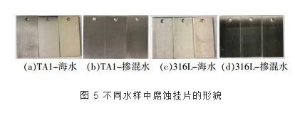 由圖 5可以看出,TA1鈦材和316L不銹鋼2種材質(zhì)在海水和摻混水中均具有良好的耐蝕性,試驗(yàn)后表面光滑,保留了金屬光澤,沒有點(diǎn)蝕出現(xiàn)。