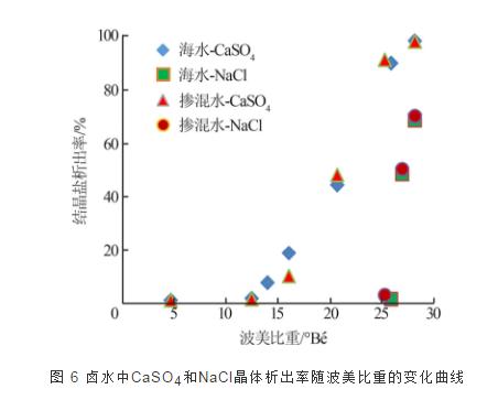 分別采用海水和摻混水進(jìn)行循環(huán)系統(tǒng)排水的蒸發(fā)濃縮試驗(yàn),試驗(yàn)過程中CaSO4和NaCl晶體的析出規(guī)律如圖 6所示。