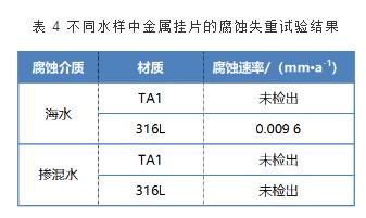 分別采用海水和摻混水,對(duì)TA1鈦材和316L不銹鋼進(jìn)行旋轉(zhuǎn)掛片試驗(yàn),結(jié)果見表 4。