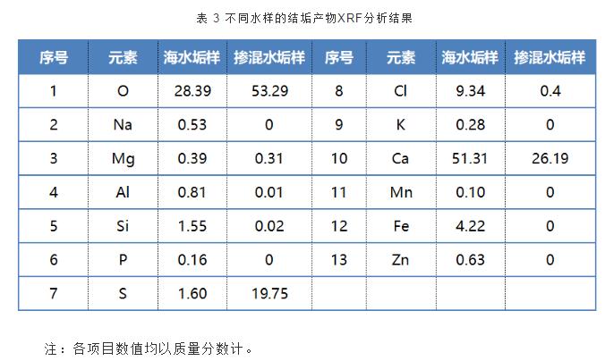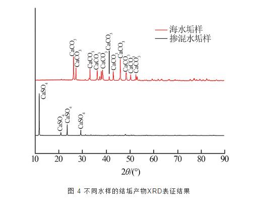 由表 3可知,海水垢樣的主要元素組成為Ca和O,而摻混水垢樣的主要元素組成為O、Ca和S。由圖 4可知,海水的結(jié)垢產(chǎn)物主要是CaCO3,而摻混水的結(jié)垢產(chǎn)物則主要是CaSO4。