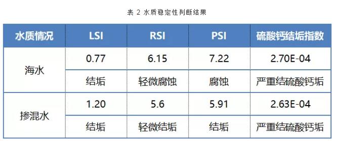 采用常規(guī)水質(zhì)穩(wěn)定性判斷指數(shù)分別對(duì)海水和摻混水進(jìn)行結(jié)垢和腐蝕傾向評(píng)價(jià),結(jié)果如表 2所示