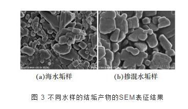 海水的結(jié)垢產(chǎn)物主要是白色粉末,而摻混水的結(jié)垢產(chǎn)物則為黃白色粉末。由圖 3可以看出,摻混水的結(jié)垢產(chǎn)物晶體尺寸略大于海水結(jié)垢產(chǎn)物,但晶體間分布比較松散。