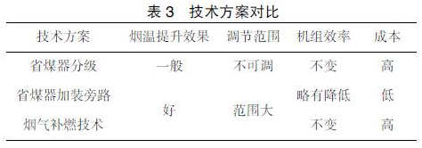 由表3可知,省煤器加裝旁路技術(shù)與煙氣補燃技術(shù)效果較好,且調(diào)節(jié)范圍大。但煙氣補燃技術(shù)國內(nèi)應(yīng)用較少且投資成本高,所以本課題最終選用省煤器加裝旁路技術(shù)。