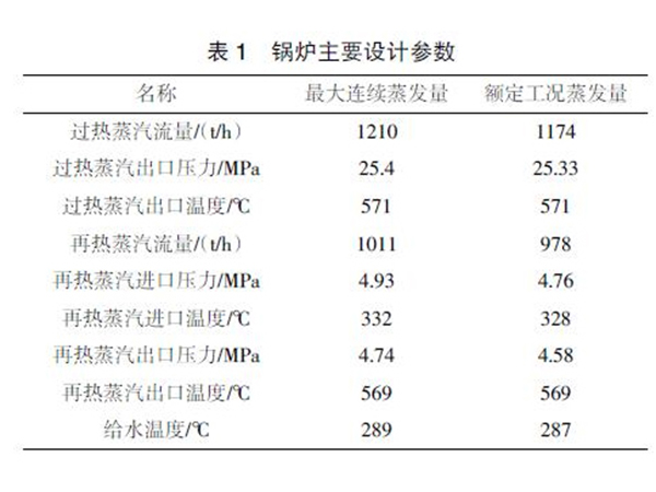 機(jī)組為2x350 MW 超臨界燃煤間接空冷供熱機(jī)組,配備上海鍋爐廠有限公司生產(chǎn)的超臨界參數(shù)變壓運行螺旋管圈直流鍋爐,采用單爐膛、一次再熱、平衡通風(fēng)、固態(tài)排渣、全鋼結(jié)構(gòu)、全懸吊結(jié)構(gòu)乇型布置形式。燃燒方式采用四角切圓燃燒,配中速磨煤機(jī)正壓直吹式制粉系統(tǒng)。鍋爐設(shè)計最低不投油穩(wěn)燃負(fù)荷及最低直流負(fù)荷臆30%BMCR(Boiler Maximum Continuous Rating,鍋爐最大連續(xù)蒸發(fā)量)。鍋爐主要設(shè)計參數(shù)見表1。