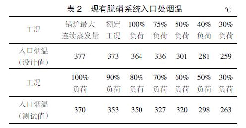 對現(xiàn)有脫硝系統(tǒng)入口處進(jìn)行各段不同負(fù)荷運行時煙溫的測試,測試結(jié)果如表2 所示。由表2 可以看出,在負(fù)荷50%時,脫硝系統(tǒng)入口(省煤器出口)煙氣溫度約300 益,由于催化劑的適宜溫度在(310-420)度,所以在負(fù)荷 50%以下無法滿足SCR 的運行要求。
