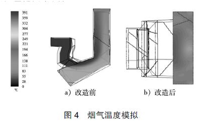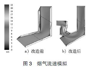 用Fluent 軟件將未改造前脫硝系統(tǒng)與改造后的系統(tǒng)分別進(jìn)行模擬,經(jīng)過建模、劃分網(wǎng)格、輸入邊界參數(shù)等步驟后。最終模擬結(jié)果如圖3和圖4所示,改造前后煙氣流速基本不受影響,因此不會對SCR 后續(xù)的均流產(chǎn)生影響;改造前后煙氣溫度基本不受影響,因此不會造成煙溫的偏差。