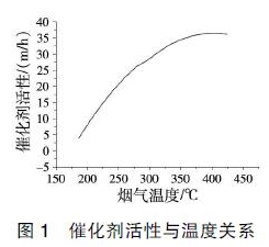 由煙氣溫度與SCR 系統(tǒng)催化劑活性關(guān)系(圖1)可以看出,隨著溫度的升高催化劑活性也越來越高。在高負(fù)荷運行時,進(jìn)入脫硝系統(tǒng)入口處的煙溫較高,處在催化劑運行的正常范圍內(nèi)。但出現(xiàn)低負(fù)荷運行時,從省煤器中出來的煙氣溫度較低,低于催化劑的正常使用溫度,過低的排煙溫度無法滿足脫硝系統(tǒng)連續(xù)、穩(wěn)定地運行。且如果長時期低負(fù)荷運行,會造成催化劑效率低,氨逃逸率增大,導(dǎo)致空預(yù)器堵塞。所以需要對脫硝系統(tǒng)進(jìn)行改造,以適應(yīng)不同負(fù)荷運行時對催化劑的影響。
