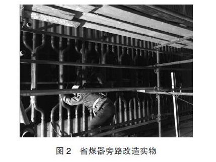 省煤器煙氣旁路技術(shù)就是在鍋爐省煤器入口的左右兩側(cè)加裝旁路煙道,旁路煙道的出口連接脫硝系統(tǒng)的入口,旁路煙道上加裝煙氣擋板,調(diào)節(jié)擋板。省煤器旁路改造實物如圖2 所示。