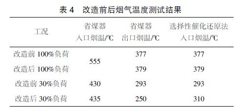 改造前后煙氣溫度測試結(jié)果如表4所示。由4表可以看出,當(dāng)機(jī)組在30%負(fù)荷的工況下,SCR入口煙溫為293度,約SCR 入口催化劑反應(yīng)溫度。經(jīng)過改造后的脫硝系統(tǒng),30%負(fù)荷的工況下,SCR入口煙溫為310度,提升到了催化劑的反應(yīng)范圍中,滿足脫硝系統(tǒng)投運的要求,且對SCR 后續(xù)的流場、溫度場均不產(chǎn)生影響,故改造方案切實可行。