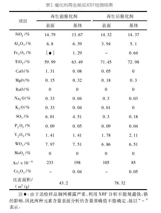 廢舊催化劑示進(jìn)過(guò)物理與化學(xué)清洗后,XRF結(jié)果如表1所示,可以看到,催化劑表面和基體的堿金屬含量(Na、K)以及堿土金屬含量(Ca、Mg)均有下降,說(shuō)明催化劑失活中毒狀況已有明顯好轉(zhuǎn),另外作為釩鈦系催化劑兩大重要指標(biāo)(Ti、V),其含量也均顯著上升,再看催化劑的比表面積(BET),與再生前相比,再生后的催化劑比表面積已增大近一倍,說(shuō)明該清洗方法能有效清除脫硝催化劑的中毒物質(zhì),同時(shí)經(jīng)浸漬后,催化劑各重要物質(zhì)含量也順利得到了補(bǔ)充。