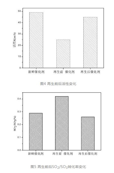 通過(guò)中式設(shè)備模擬電廠的煙氣條件,本公司對(duì)不同催化劑進(jìn)行活性檢測(cè),數(shù)據(jù)如圖4、5所示:可以看出,催化劑經(jīng)長(zhǎng)時(shí)間運(yùn)行后,活性及SO2/SO3轉(zhuǎn)化率已明顯上升,其數(shù)值已超過(guò)新鮮催化劑的1.5倍,經(jīng)過(guò)清洗再生后,可觀察到:脫硝催化劑活性K值已提高,而SO2/SO3轉(zhuǎn)化率已顯著下降,據(jù)統(tǒng)計(jì),催化劑活性K值已恢復(fù)到初始值的90%以上,而SO2/SO3轉(zhuǎn)化率則優(yōu)于新鮮催化劑,說(shuō)明采取的該再生工藝能有效的處理廢舊催化劑且滿足電廠使用條件,另外也實(shí)現(xiàn)了資源的循環(huán)利用。