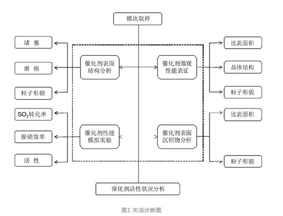 失活催化劑能否再生,與催化劑失活原因及再生的難易程度相關(guān)。較易再生的失活催化劑狀況包括:磨損、積灰或金屬氧化物等,而對(duì)于永久性的重度中毒或熱燒結(jié)引起的失活則很難或根本無(wú)法再生。因此,對(duì)于入廠的廢舊脫硝催化劑,應(yīng)在前期進(jìn)行失活診斷,判斷其再生價(jià)值及可使用率,其步驟具體如圖1所示。