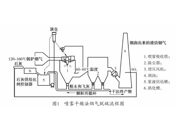 噴霧干燥法工藝系統(tǒng)主要包括以下三大關(guān)鍵設備:吸收劑漿液制備裝置,SO2吸收系統(tǒng),副產(chǎn)物收集和再循環(huán)系統(tǒng)。