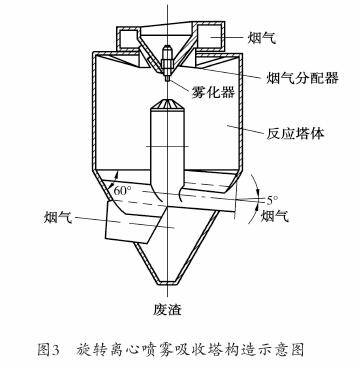 SO2吸收系統(tǒng)是整個工藝的核心,主要部件為霧化器。吸收劑漿液經(jīng)霧化器霧化, 一經(jīng)與煙氣接觸,就發(fā)生強烈的反應,將大部分水分蒸發(fā)掉,形成含水量較少的固體產(chǎn)物。同時,煙氣溫度迅速降低。目前國內(nèi)常用的霧化器有兩種,即氣流型霧化器和旋轉(zhuǎn)離心霧化器,其主要構(gòu)造分別見圖2和圖3