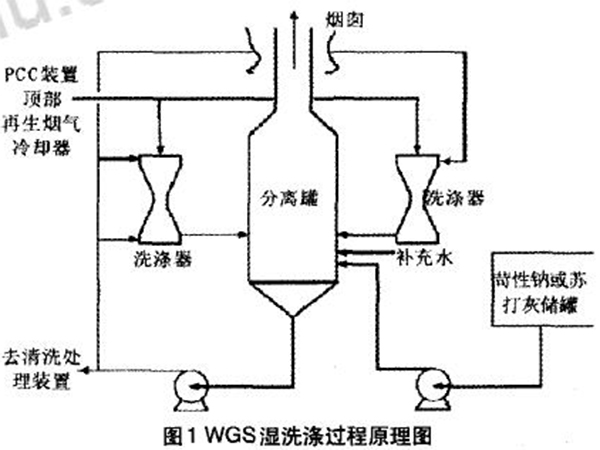 WGS濕洗工藝主要包括濕式洗氣元件(WGSR)與凈化處理元件(PTU)這倆個(gè)部分。用富堿性溶液來(lái)用作吸收劑。在煙道氣體第一次進(jìn)入WGSR后,顆粒和SOx會(huì)被分離取出。WG—SR主要由文丘里管及分離塔兩部分構(gòu)成。吸收劑與煙氣同時(shí)進(jìn)入文丘里管后,吸收過(guò)程會(huì)發(fā)生在文丘里管的湍流部分。吸收液在減速墻中吸收液體,最終形成一層薄膜,隨機(jī)被分解成液滴,由于進(jìn)入喉部位置的速度不同步,煙氣和液滴兩者間會(huì)發(fā)生慣性碰撞,就會(huì)把催化劑粒子保留在喉嚨位置,用緩沖溶液洗掉了;SOx被吸收在喉部和膨脹節(jié)段中,產(chǎn)生亞硫酸鈉和硫酸鈉(見圖1)。