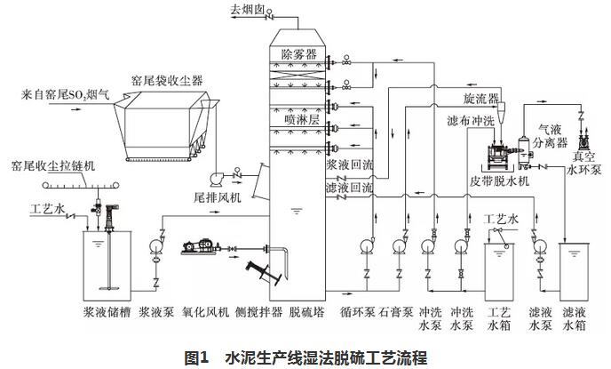 石灰石-石膏濕法脫硫工藝是目前技術最成熟、脫硫效率最高、應用最廣泛、運行最穩(wěn)定的脫硫工藝。結合水泥生產線工藝特點,將窯尾收塵系統(tǒng)替代脫硫劑粉磨系統(tǒng),故本項目脫硫工藝由以下主要的子系統(tǒng)構成,包括:脫硫塔系統(tǒng)、脫硫劑制備系統(tǒng)、石膏脫水系統(tǒng)等。水泥生產線濕法脫硫工藝流程見圖1。