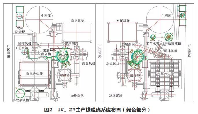 該項目兩條生產線窯尾生料車間布置緊湊,生產線建設規(guī)劃時并未給脫硫系統(tǒng)預留空間,結合現(xiàn)場實際情況,經過多次協(xié)商討論和設計調整,最終確定方案為脫硫塔放置在窯尾塔架、增濕塔、窯尾收塵、高溫風機之間的空檔內,其他子系統(tǒng)盡量靠近脫硫塔布置。1#、2#生產線脫硫系統(tǒng)布置見圖2。圖2中綠色部分為濕法脫硫系統(tǒng)主要增加設備和建筑。由于空間狹小,大大增加了脫硫系統(tǒng)的設計、施工、安裝難度。