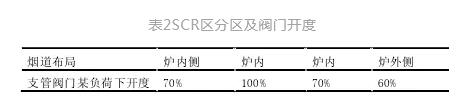 此方案中SCR反應(yīng)器出口NOX測點數(shù)量及布置要與噴氨分區(qū)數(shù)量形成一定的對應(yīng)關(guān)系,8個出口NOX測點均勻度要控制在20%左右。調(diào)節(jié)開度如表2所示: